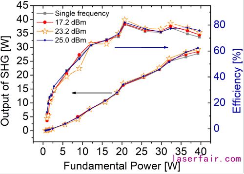图2 单频和少频条件下,正弦射频功率分别为17.2 dB,23.2dB和25 dB时,532nm的输出和转换效率。