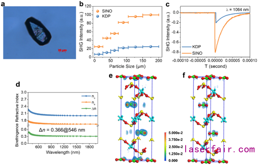 复合型二元氧阴离子晶体结构在光学各向异性和倍频效应两种光学响应中有独特的优势。首先,在稀土硝酸盐中引入含孤对电子氧阴离子[IO3]?基团,提高了材料整体的光学各向异性。其次,[IO3]?和[NO3]?两种氧阴离子基团在二维层状结构中采用对齐排列方式,增大了层内键合和层间相互作用的差异,赋予材料相比于传统单一氧阴离子无机金属氧化物增益的光学各向异性和倍频效应。同时,密度泛函理论模拟计算表明Sc(IO3)2(NO3)大的线性光学和非线性光学响应源自于二维层状结构中[IO3]?和[NO3]?基团的协同效应。作者通过实空间原子切割方法进一步证明了双折射率的增益主要来源于含孤对电子的氧阴离子[IO3]?基团,而强的倍频效应则主要源自于π共轭[NO3]?基团。最终,该复合型二元氧阴离子晶体Sc(IO3)2(NO3)表现出短的紫外吸收截止边(298 nm),宽的光学带隙(4.15 eV),大的双折射率(0.348@546 nm),该双折射率值在目前已报道的无机金属氧化物晶体中为最大值;Sc(IO3)2(NO3) 同时具有强的倍频效应(4.0 × KDP),是一例性能优异的紫外双功能晶体材料。该工作为探索紫外波段下大双折射晶体材料提供了一种全新的策略。