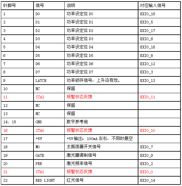 EXIO接口经转换板转接之后,对应欧陆娱乐器引脚如表所示,表中红色字体为输入信号,其他为输出信号