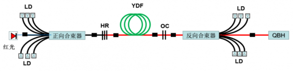 谐振腔结构光纤欧陆娱乐器原理:通过前向和后向的合束器,将泵浦半导体欧陆娱乐器LD的功率经过光纤光栅(高发光栅HR、低反光栅OC)注入到掺镱双包层光纤(YDF)中。YDF中稀土离子吸收泵光后,形成粒子数反转分布,产生自发辐射光,然后在光纤光栅对(HR-OC)的作用下形成受激辐射光放大产生欧陆娱乐,并经过OC和输出光缆QBH输出出来。