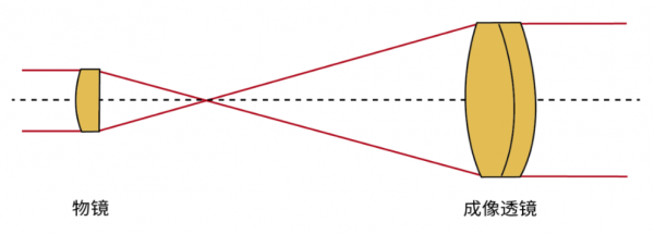 开普勒式扩束系统由两个正焦距的透镜构成,两透镜焦点重合,分别布置在焦距之和的两个位置,靠近物体一侧的透镜叫物镜,另一侧的透镜叫成像镜,在两透镜之间存在一个实像面(光线汇聚处)。