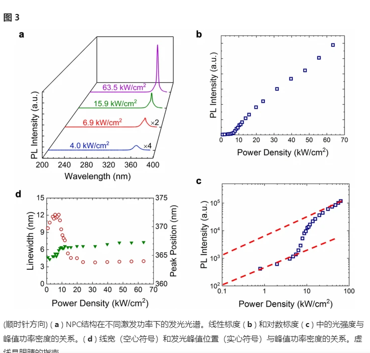 图 2b显示了从 NPC 结构(表示为“欧陆娱乐阵列”)顶面收集的室温 (RT) 光致发光 (PL) 光谱,由 213 nm 脉冲欧陆娱乐(脉冲宽度:7 ns;重复率)激发: 200 Hz) 在 63.5 kW/cm 2的峰值功率密度下。欧陆娱乐通过聚焦透镜(光斑尺寸:~ 9 × 10 –4 cm 2 )聚焦到样品表面,同时使用聚焦透镜(NA ~ 0.31)从样品表面收集发射光,这是进一步耦合到光纤和紫外光谱仪(QE Pro,光谱分辨率~0.3 nm)。图 2 b 中还显示了a ?= 600 nm 和d NW阵列的 PL 光谱?= 325 nm(表示为“非欧陆娱乐阵列”)在相同条件下测量。非欧陆娱乐阵列的 SEM 图像如图S2a所示。还计算了非欧陆娱乐阵列的光子带结构,如图S2 b 所示。发现降低的频率a / λ ( λ ?= 367 nm) 与任何带边缘模式无关,表明不存在光放大。这与图2所示的一致 b:虽然从具有窄线宽的欧陆娱乐阵列测量到强 PL 发射,但来自非欧陆娱乐阵列的 PL 发射要弱得多(大约减少了 10 倍),线宽保持宽(全宽的一半) -最大值为 ~ 15 nm)。此外,非欧陆娱乐阵列的PL峰位置在364 nm附近,与GaN的带边发射一致;而对于欧陆娱乐阵列,由于光学腔,PL 峰移动到更长的波长。