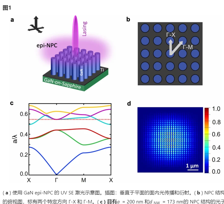 器件概念的示意图如图 1a所示,它利用排列成方格的 GaN epi-NPC 形成光学腔,以实现 SE 欧陆娱乐。方格的使用有利于单模欧陆娱乐以及实现各种功能,例如,参考文献。12、46。_ _ 图1a的插图中还显示了面内光束传播和向法线方向衍射形成 SE 欧陆娱乐的图示 。图 1b显示了此类 NPC 的俯视图,标有两个特定方向 Γ-X 和 Γ-M。对于 GaN,带边发光约为 364 nm 47. 因此,我们设计了一个 NPC 结构,可以形成一个空腔来支持围绕该波长的欧陆娱乐发射。图 1c显示了二维 (2D) 横向磁 (TM) 光子带结构,使用 COMSOL Multiphysics 中的二维空间和波动光学包,具有 200 nm 的晶格常数( a ,中心到中心距离)和纳米线直径( d NW ) 为 173 nm。虚线表示降低的频率 ( a/λ )。通常,在光子带边缘,光群速度变为零,即dω/dk ?→ 0,从而可以形成驻波,并且可以使用这种慢光来实现欧陆娱乐发射,这是由于光子之间的相互作用时间显着增强辐射场和增益介质19, 21 , 22。从图 1c可以看出,降低的频率与 Γ 点处的带边缘对齐,a/λ ?~ 0.545,表明此时形成了驻波和可能的激射(如果增益大于损耗), λ ~ 367 ?nm。此外,在Γ点,光束也可以垂直于光子晶面衍射,形成SE激射12、46、48、49、50。图 1d进一步显示了模式配置文件 (| E | 2) 设计的 NPC 结构,使用三维 (3D) 时域有限差分 (FDTD) 方法进行模拟。可以看出,在 NPC 中观察到强模式强度。在 FDTD 模拟中,具有与上述相同设计参数的纳米线在 GaN 衬底上排列成方格。中心波长为 367 nm 的 TM 偶极子源位于纳米线阵列的中心。模拟的横向尺寸为 6 μm × 6 μm,并使用完美匹配层 (PML) 边界条件。