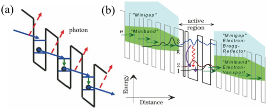 图1 (a) 级联量子阱中光子辅助量子隧穿实现光放大;(b) QCL的有源区在偏压下的导带结构示意图[8]