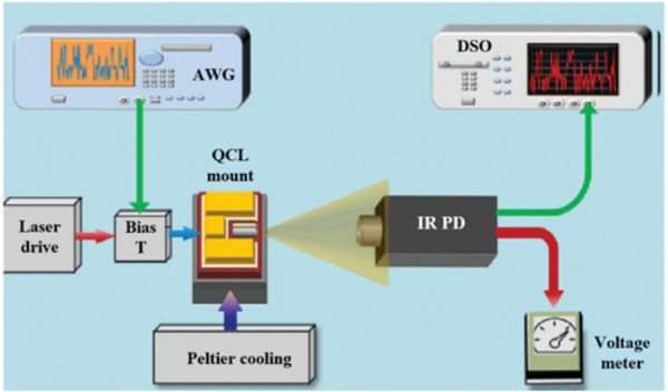 2001年,贝尔实验室率先在高速QCL方面开展了研究,并首次展示了响应频率达到10 GHz的QCL,随着QCL技术的持续发展,其在自由空间光通信领域的应用前景也逐渐受到通讯行业的广泛关注;2021年,法国巴黎电信公司的研究人员于开发出了一种基于QCL的光子混沌自由空间光通信系统,可成功实现0.5 Mbit/s的消息加密传输速率。基于QCL的自由空间光通信系统在多个领域具有广阔的应用前景:在军事通信中,QCL的高安全性和抗干扰能力使其成为理想的选择;在卫星通信中,QCL的高效传输特性有助于实现高速数据链路;在日常生活中,QCL也有望为宽带互联网接入提供新的解决方案。