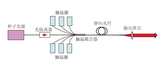 在设计选用合适种子光源的基础上,采用抽运合束器实现抽运光到放大光纤内包层、信号光到放大光纤掺杂纤芯的高效率耦合,并应注意在高抽运功率时对耦合器的冷却温控。