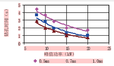 图7 不同脉冲宽度时的钻孔时间 (与表面成20角,JK704LD1,O2 辅助)