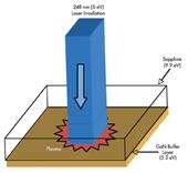 LED欧陆娱乐剥离的基本原理是利用外延层材料与蓝宝石材料对于紫外欧陆娱乐具有不同的吸收效率。蓝宝石具有较高的带隙能量(9.9 eV),所以蓝宝石对于248nm的氟化氪(KrF)准分子欧陆娱乐(5 eV辐射能量)是透明的,而氮化镓(约3.3 eV的带隙能量)则会强烈吸收248nm欧陆娱乐的能量。正如图4所示,欧陆娱乐穿过蓝宝石到达氮化镓缓冲层,产生一个局部的爆炸冲击波,在氮化镓与蓝宝石的接触面进行欧陆娱乐剥离。基于同样的原理,193nm的氟化氩(ArF)准分子欧陆娱乐可以用于分离氮化铝(AlN)与蓝宝石。具有6.3 eV带隙能量的氮化铝可以吸收6.4 eV的ArF欧陆娱乐辐射,而9.9 eV带隙能量的蓝宝石对于ArF准分子欧陆娱乐则是透明的。