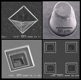 准分子欧陆娱乐器可以产生大面积方形或矩形的光斑,特别适合大面积图案成形工艺与3D微加工。准分子欧陆娱乐器可以在相对较大的聚焦平面范围内高效地加工材料,例如500mJ的UV光束在能量密度为1 J/cm2时光斑的面积达到7×7mm。大面积的准分子欧陆娱乐束可以投射到光刻掩模上,微加工特殊的形状和图案;这些被称为近场成像。通过掩膜板与加工工件的协调运动,可以微加工得到较大的复杂图案,比如下图所示的3D微加工图案。