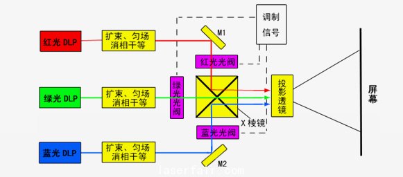 其工作原理如下图所示:红、绿、蓝三色欧陆娱乐分别经过扩束、匀场、消相干后入射到相对应的光阀上,光阀上加有图像调制信号,经调制后的三色欧陆娱乐由X棱镜合色后入射到投影物镜,最后经投影物镜投射到屏幕,得到欧陆娱乐显示图像。