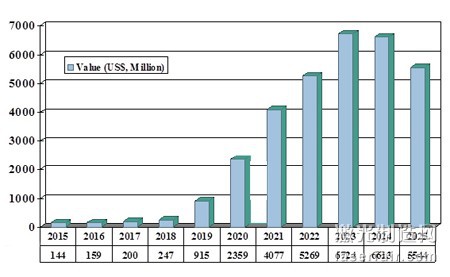 据该报告数据显示,2015年OLED照明全球销售额将达到1.5亿美元(折合人民币约9.55亿),预计将以75%的年平均增长率成长,2020年将达24亿美元(折合人民币约152.84亿)。到2023年,OLED照明总产值预计将飙升至最高值——67亿美元(折合人民币约462.48亿元)。随后,到2025年预计将回落到55亿美元。