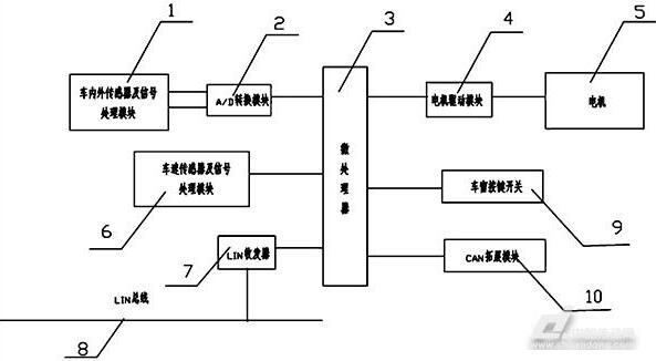 新能源汽车车身智能控制模块,包括微处理器、A/D转换模块,车内外传感器及信号处理模块、车速传感器及信号处理模块、电机驱动模块、电机、车窗按键开关、LIN收发器及LIN总线以及CAN拓宽模块。其中车内外传感器及信号处理模块通过A/D转换模块与微控制器交换信号,所述微处理器对车速传感器及信号处理模块、车窗按键开关提供的信号进行反馈处理;所述微处理器通过电机驱动模块对电机进行控制,所述微处理器通过LIN收发器将信号传递到LIN总线上。采用LIN作为控制总线,有效节约了成本;可以根据车速及车内外温差调整车窗升降的速度,避免因骤开骤降导致的车内不稳定。