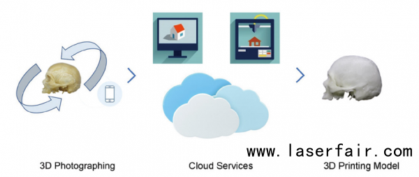 技术路线流程图,涉及三个主要阶段。首先,对采集的标本进行全方位拍摄,以从所有可能的方向获得足够的2D图像。其次,使用基于云的专用服务器将2D图像转换为数字模型。第三,在编辑之后,将数字模型和3D打印设置数据应用于3D打印机进行打印。