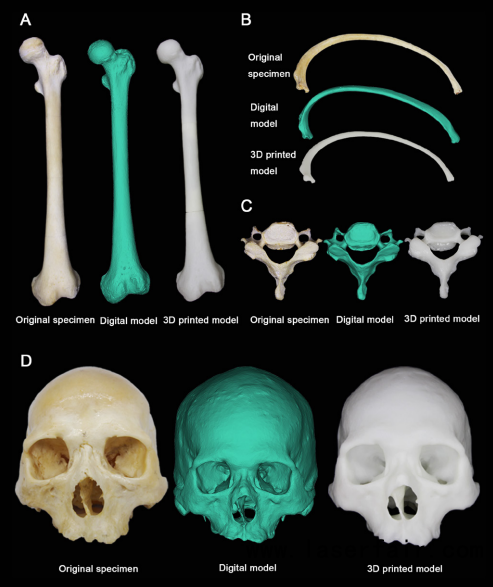 使用SLA技术制成的原始样本,数字模型和3D打印模型。(A)股骨,(B)肋骨,(C)颈椎骨,(D)头骨。