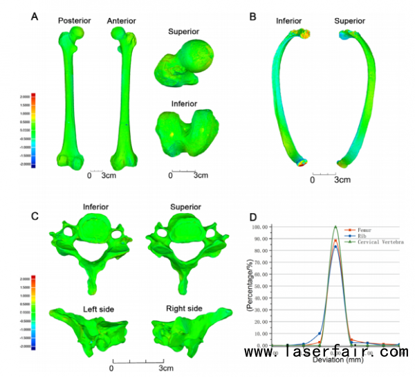 分析原始样本和3D打印模型之间的偏差。偏差光谱上的等级均为0.5mm;绿色表示偏差在-0.5到0.5mm之间;较热的颜色表示正偏差范围为0.5到2mm;冷色表示负偏差范围为-0.5至2mm。(A)股骨,(B)肋骨,(C)颈椎骨的偏差分析;(D)偏差分布(%)。