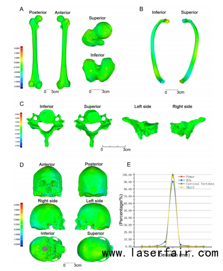 分析数字模型和3D打印模型之间的偏差。偏差光谱上的等级均为0.5mm;绿色表示偏差在-0.5到0.5mm之间;较热的颜色表示正偏差范围为0.5到2mm;冷色表示负偏差范围为-0.5至2mm。(A)股骨,(B)肋骨,(C)颈椎骨的偏差分析;(D)头骨;(E)偏差分布(%)。