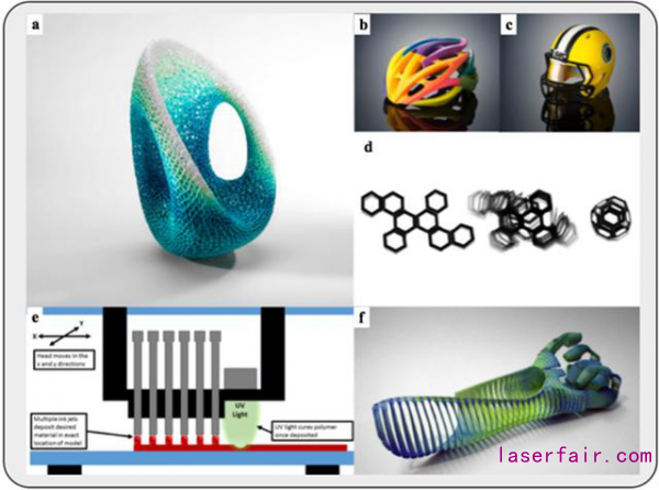 图1为传统制造工艺和3D打印工艺的对比,传统制造工艺必须先单独制造出部件来然后在通过后期的连接将其组合成一个整体。这一过程同传统工艺制作巧克力是一样的繁琐复杂。对多材料打印来说,打印复合梯度材料或渐变材料可以在一个机器中完成。聚合物材料的3D打印系最早应用的多材料打印案例。主要是因为该材料打印时相对简单而且相互间兼容性也比较好。多颜色的打印制品,如自行车头盔、足球头盔、防护手套等,均可以在满足使用功能的前提下让该物品变得更加多姿多彩,如图2所示。同时打印出的多材料打印制品,可以随环境变化而发生变化,这就是3D打印中的黑科技4D打印。尽管多材料3D打印的部件如此令人激动人心,他们大多用作概念原型来证明该多材料系统、功能的可行性。当然,也只有经历了这一原型阶段之后,多材料打印才会开始真正走进制作多材料金属复合材料打印的发展时期。3D打印单一材料已经进入了实用阶段。多材料打印中独特的连接方式使得多材料打印同传统制造工艺相比没有焊缝存在,从而有效避免或减少了应力集中带来的危害。同时多材料打印时使用的原材料基本是粉末,使得传统工艺中两者不易混合的工艺也变得十分容易。