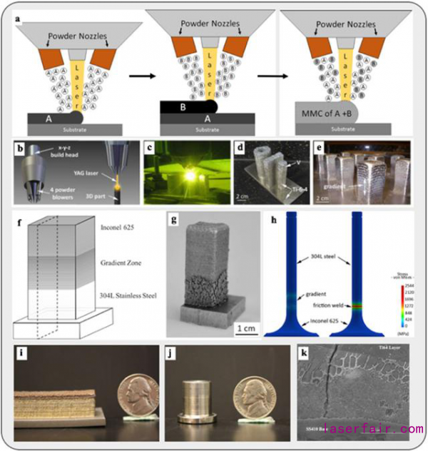 多材料打印时展现出来的独特的魅力,不仅可以将两种不同的材料实现100%的混合,同时实现设计结构件性能的均一性。这一理念导致了打印In718 和GRCoP-84复合材料,这是一种无磁性和有磁性的不锈钢,Nb在Ti6Al4V中混合比例不同等,如图3。多材料打印还可以通过添加不同的物相而改变金属的性质,如二次金属强化相。而且通过控制不同的添加量,还可以控制产品的性能。