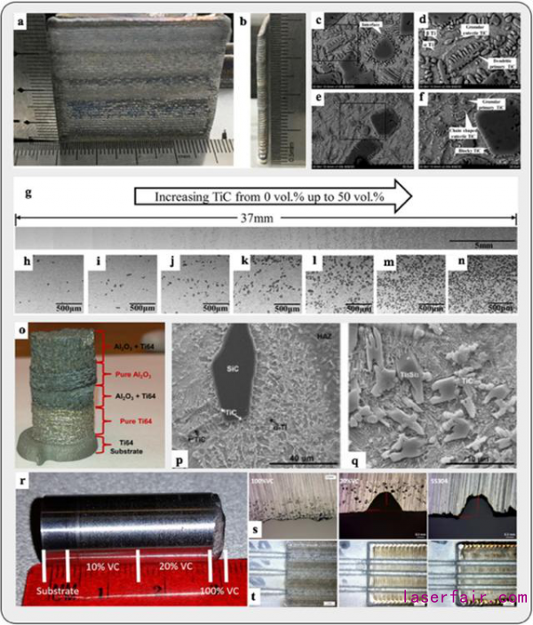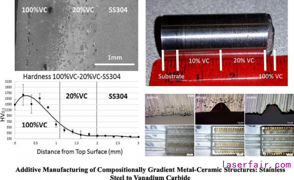 由于多材料打印可以一次成型且制造特定区域具有特殊性能的制品而成为非常有影响力和吸引力的技术。先进的金属多材料打印可以通过金属-金属、金属-陶瓷混合而实现特定区域的独特性能。同传统的局限于焊接结构相比,采用多材料打印就很容易实现功能、梯度材料的制备以提高其服役性能。金属-陶瓷材料的多材料打印,如SiC在Ti6Al4V中。同理VC在不不锈钢中,Ti6Al4V-Al2O3 中的功能梯度材料等。沉积100%的Al2O3 在Al2O3 基材中,然后逐渐过渡到打印不锈钢,在过渡到打印Ti,已经被证明有多种用途。最终还有原位合成TiB-TiN增强的Ti6Al4V合金等。