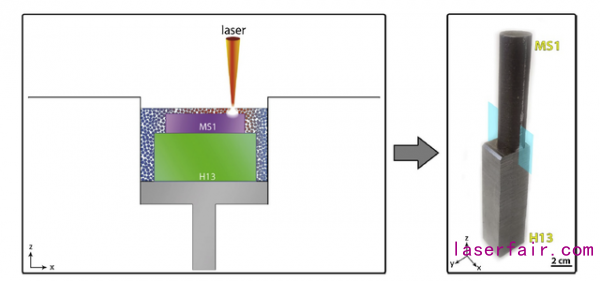 图6 欧陆娱乐粉末床打印MS1(马氏体不锈钢)-H13(热作模具钢)多材料的示意图