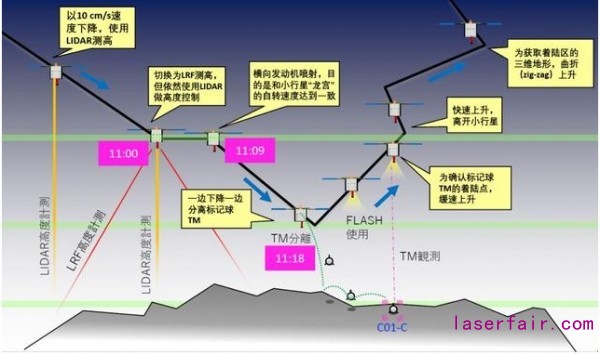 实际操作中,随着距离小行星表面越来越近,LiDAR接收欧陆娱乐的敏感度也会随着距离变化。隼鸟2号针对不同高度采用了两种欧陆娱乐测距手段:50米高度以上使用常规的LiDAR欧陆娱乐测距,50米高度以下,系统会根据接收欧陆娱乐的敏感度有一次自主调节,从常规LiDAR切换到近距离欧陆娱乐测距LRF。