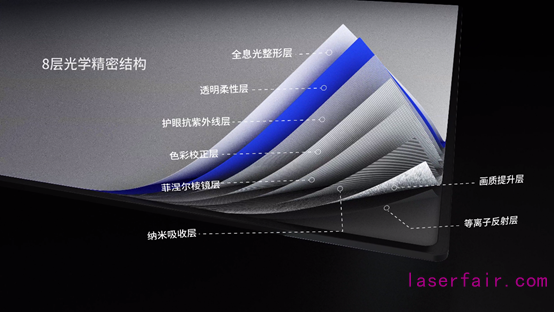具体来说,ALFA技术实现了专利微纳结构设计、全息光整形技术、光吸收纳米涂层、超薄柔性复合薄膜四大技术层面的突破,用复杂的光学光刻方法做了屏幕的表面处理,使其在保持了高清、高画质显示状态的同时,又可以消除镜面反射的效果,解决了传统投影屏幕的低增益、亮斑、“鬼影”等诸多行业痛点。