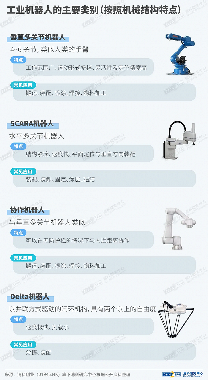 工业机器人指面向工业领域,通过编程或示教方式实现自动化,具备拟人形态和功能,可以代替人工完成各类繁重、乏味或有害环境下体力劳动的机械装置。根据机械结构的特点,可以将工业机器人划分为4类,垂直多关节和协作机器人的工作范围最广,其中装配是较为普遍的应用场景。
