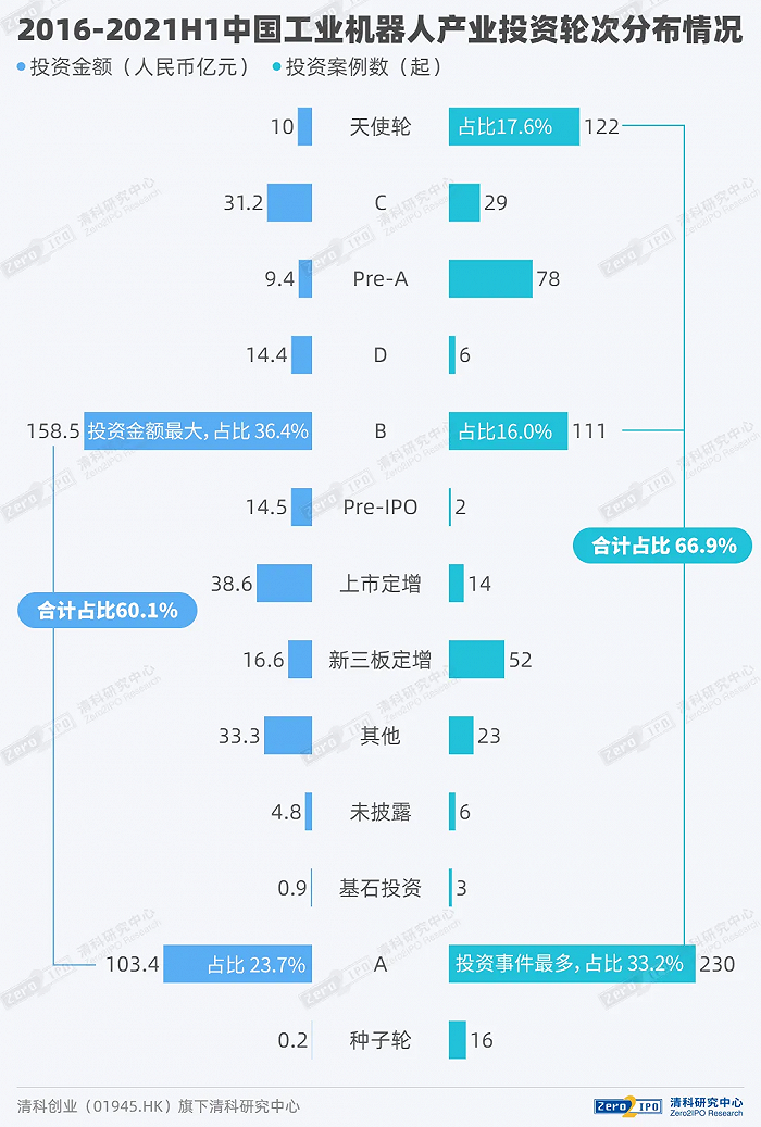 根据清科创业旗下PEDATA MAX数据,2016-2021H1,中国工业机器人领域披露投资事件692起,披露投资金额约435.9亿元;零部件制造和集成应用环节投资热度较高;A轮、天使轮及B轮案例数合计占比近7成;广东、北京和长三角地区是热点地域。