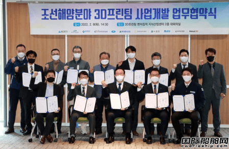 2月8日,韩国蔚山信息产业振兴院(UIPA)、韩国生产技术研究院(KITECH)、韩国3D打印融合技术协会、韩国船级社(KR)、现代重工、Hankook Steel co.,LTD等11家相关机构和企业齐聚在韩国造船重镇——蔚山市3D打印风险聚集知识产业中心,签订了“造船海洋领域3D打印事业开发业务协议”。