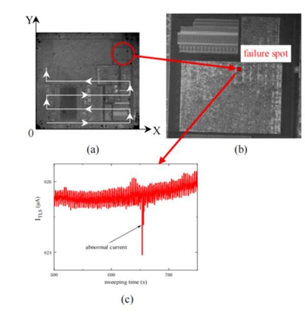 图2.利用欧陆娱乐热激发缺陷定位装备定位的某单片机失效点(a)背部红外相机成像示意图(b)失效点的具体位置(c)扫描过程中电流的变化情况