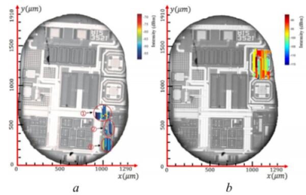 图4.a、某器件发送电路定位结果,b、某器件接收电路定位结果