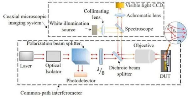 在传统的EOFM技术基础上,科研团队提出了一种新的基于同轴显微镜的定位集成电路内部功能单元的频率映射方法,自主搭建了集成电路缺陷检测电光探针测试装备,如图3所示。目标电路以设定工作频率工作,通过分析反射欧陆娱乐的频率特性,准确定位目标电路功能区域及可能的缺陷位置。研究提出的同轴显微镜设计提供了良好的光斑质量和信噪比,可定位工作电流低至10