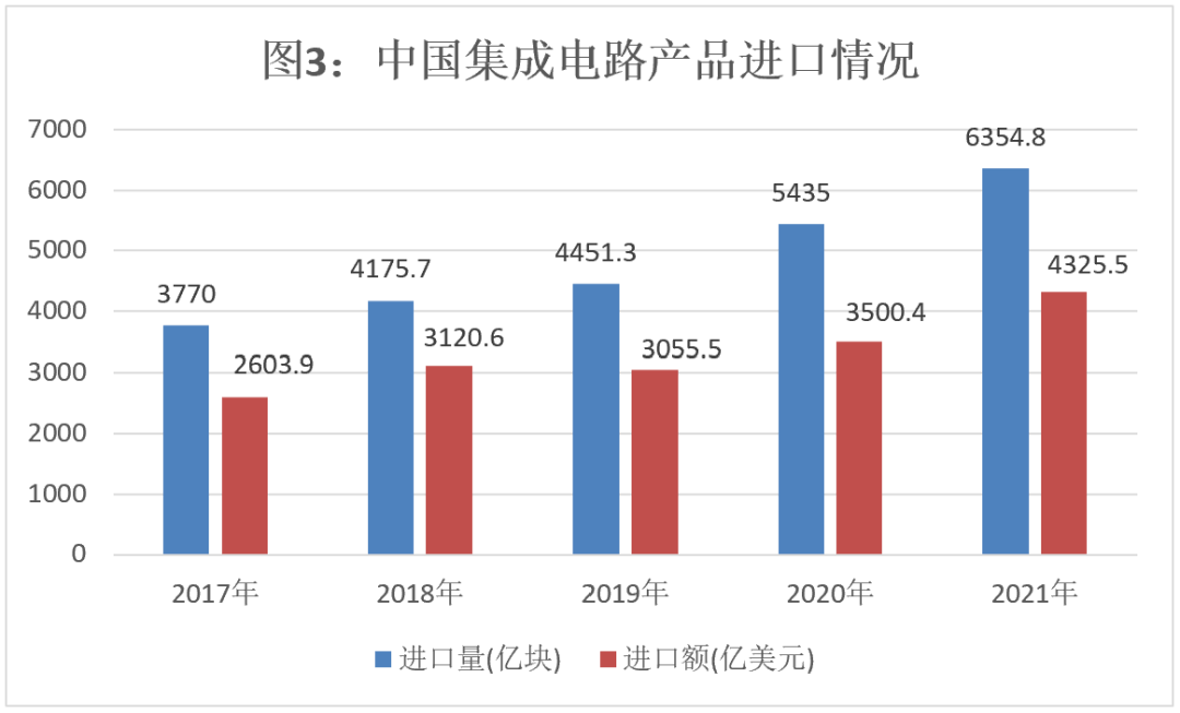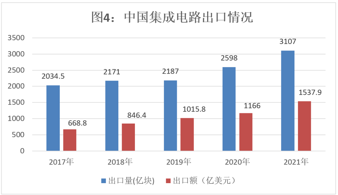 2021年中国集成电路产品进出口都保持较高增速。根据海关统计,2021年中国进口集成电路6354.8亿块,同比增长16.9%;进口金额4325.5亿美元,同比增长23.6%。2021年中国集成电路出口3107亿块,同比增长19.6%,出口金额1537.9亿美元,同比增长32%。