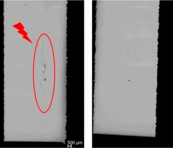 △图3:(左)在 1.2343 和 200 摄氏度的预热下出现裂纹;(右)在 500 摄氏度时无裂纹。在后续步骤中,剩余的小缺陷可以通过退火来纠正。