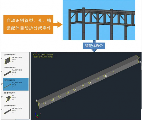 WiseCAM Tube维宏欧陆娱乐管材切割控制系统支持igs、stp文件的导入。用户可直接将钢结构装配体导入软件,软件自动识别出其中的钢材零件,无需人工拆数模,方便快捷。