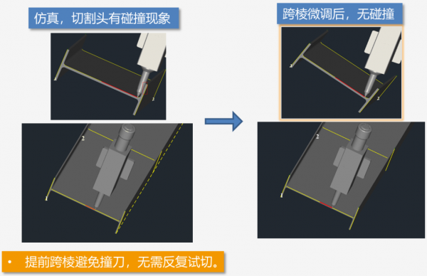 对于钢结构行业中较常用到的工字钢、C型钢等WiseCAM提供了跨棱微调功能,操作简易,降低用户使用门槛,在跨棱的位置提前偏转切割角度,另加工更加安全平滑。