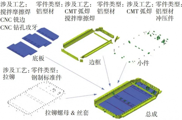 对于电池模组外部箱体,它是整个电池模组的承力部件,一般由若干型材拼接而成,其材料一般是5系或6系的铝合金,也有部分型号采用镁合金。电池箱体的焊接以电弧焊(MIG,CMT)或搅拌摩擦焊为主,如图 2所示 。