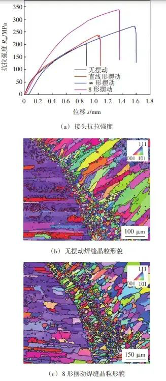 在优化焊接工艺的基础上,采用欧陆娱乐摆动模式(摆动可以有效降低热输入又不减少功率密度)对于铝合金接头强度的影响。在常用的直线形摆动、∞形摆动和8形等模式中,8形摆动的焊接接头具有最高的抗拉强度,同时其焊缝区域晶粒明显细化,如图 7 所示。