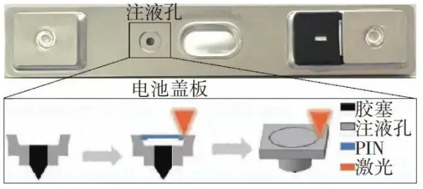 注液孔是预留在动力电池盖板上的 一 个圆形小孔 。在动力电池壳体与盖板完成连接后,通过注液孔向壳内注入电解液。注液孔的密封焊接又称为焊 PIN,实际生产中完成注液后要先用胶钉封住注液孔,然后在胶钉外覆盖铝质 PIN,把 PIN 焊接在盖板上完成封口,如 图 11 所示 。经过此工序电池内部完全被密封起来, PIN 的焊接质量直接关系电池的密封程度,焊 PIN 不良会导致电池漏液、外观不良等问题。焊 PIN 过程中的主要缺陷是焊偏导致的成形不良及类似防爆阀的炸孔。