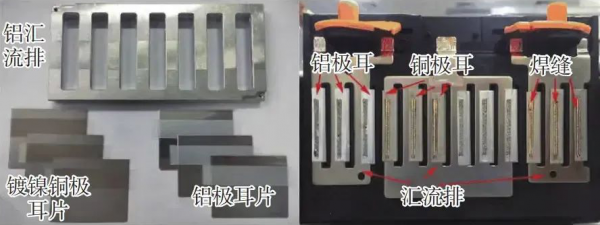 动力电池的极耳与汇流排一般是由铝或铜材料制造而成,如图14所示,因此汇流排的焊接接头形式一般是Al-Al同种或者 Al-Cu,Al-Fe(谁家高压连接这样设计)异种接头。焊接时的主要问题是气孔、热裂纹及异种金属界面脆性金属间化合物导致的强度降低。