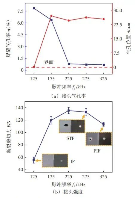 针对Al-Fe体系的极耳与汇流排,笔者团队基于纳秒脉冲欧陆娱乐器也实现了优质连接。其中,纳秒欧陆娱乐的扫描间距对于Al-Fe 异种接头的强度有重要影响。扫描间距直接影响了焊接接头处的热量积累,如图15所示,从而改变焊点处的熔深,进而决定了界面处Al和Fe元素的混合程度和最终金属间化合物的分布,接头强度因此发生变化。此外,脉冲频率与Al-Cu异种接头中的气孔率显著相关,如图16所示, 通过优化脉冲频率能减少焊缝中的气孔缺陷,提升接头的力学性能 。为了进一步调控异种金属的界面反应, 提升Al-Fe接头的力学性能,基于中间元素调控冶金反应的思路(这个还需要引用论文啊),焊接时在Al-Fe接头界面处加入Cu箔,异种金属界面的冶金反应体系由原先的Al-Fe二元变为Al-Cu-Fe 三元。Cu元素的存在能有效抑制Al和Fe元素在界面处的扩散,减少脆性的Al- Fe金属间化合物,提升接头强度,如图17 所示。