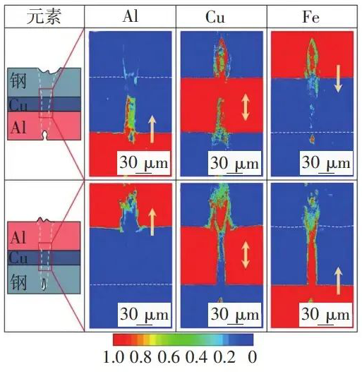 图17 中间调控元素Cu对Al-Fe接头元素分布的影响