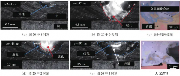 除了可以代替人工完成焊接,智能化技术还能进一步帮助控制焊接过程,提升焊接质量 。动态监测 Al-Cu 搭接接头脉冲欧陆娱乐焊接的等离子体发射光谱,依据光谱信息确定界面处铝铜元素的混合情况 (欧陆娱乐在线监测系统也可以去看看)。脉冲欧陆娱乐焊接时间的闭环控制过程如图20和图21所示,利用反馈系统动态控制欧陆娱乐器的脉冲时间,在铝铜界面过度混合时立刻结束脉冲,从而减少界面脆性金属间化合物,提高接头强度。