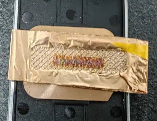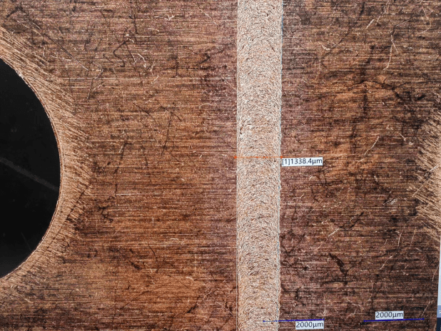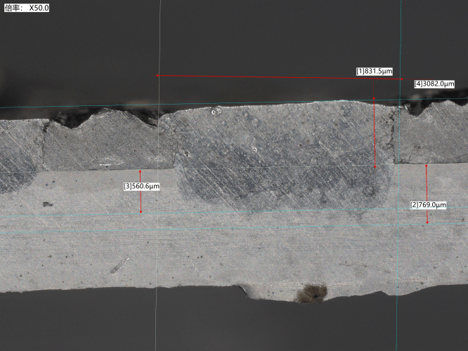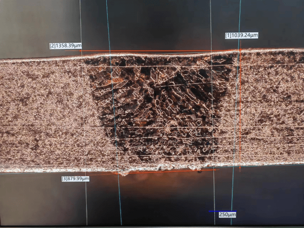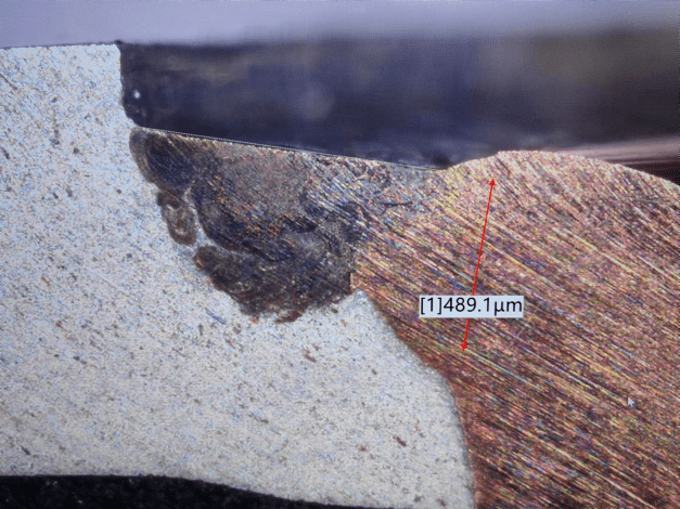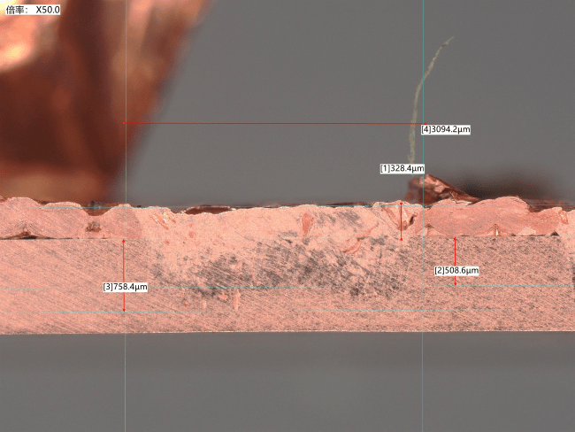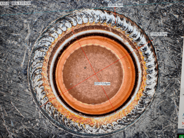 (5)多层极耳与方壳电池极柱焊接,焊接方式:铜箔-铜 叠焊,焊材:50层负极耳(超声波预焊)和方壳电池负极柱3mm,焊接结果见下: