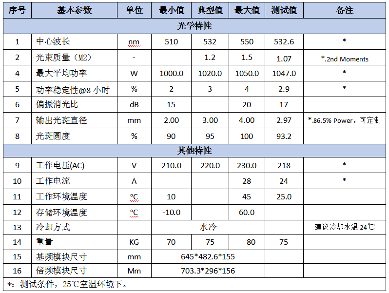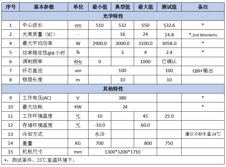 公大欧陆娱乐3000W多模连续绿光测试部分数据 产品PN: GCL-3000-B-I-W