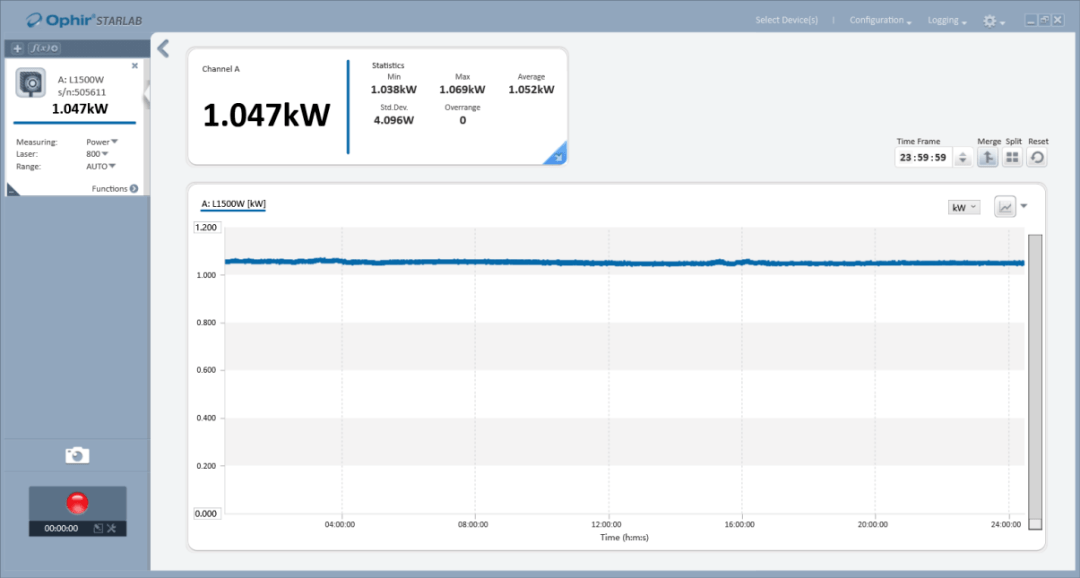 图-3 1000W 单模光纤绿光24小时功率稳定性测试 ~0.4%@RMS 注:功率波动,主要受室内温度影响。