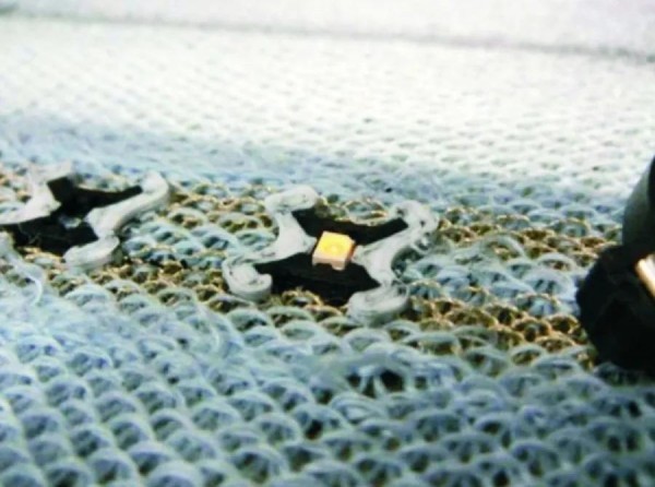 开发导电纺织品最常见的方法是在织物表面附着导电材料,实现方法包括层压、涂层、印刷、喷涂、离子电镀、化学镀层、真空金属化、阴极溅射和化学气相沉积等。3D打印机能够准确地打印出所定义的形状。通过这种方式,可以将导电纱线或涂层连接起来,特别是与无引线的SMD(表面安装设备)元件连接。同时,3D打印可以调整电子元件的结构,以实现与织物最合适的结构状态。德国比勒费尔德应用科学大学的Grimmelsmanna等,利用3D打印技术在使用导电Shieldex纱线织造的包含电路路径的面料上直接打印,使3D打印的物体作为导电线与小型电子元件之间连接,从而让纺织品发光,如下图所示。