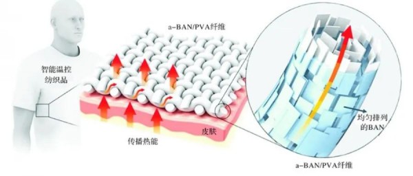 具有调节温度的智能纺织品种类繁多,如当前市面上最为常见的温湿度调节纺织品,是通过去除多余的水分来降低人体温度,但这类纺织品只有在身体和织物之间的空气处于高湿度水平时才能被触发,这限制其在湿度水平较低时的应用。另外还有其他温控技术,包括带有相变材料的冷袋纺织品、空气冷却纺织品和液体冷却纺织品等,但也都有其局限性。研究人员为了解决这类问题,在开发热调节纺织品方面做了大量的工作。马里兰大学利用一种在聚乙烯醇(PVA)聚合物基体中嵌入了氮化硼纳米片(BNNSs)的复合材料进行3D打印,制成能使人体温度快速下降的智能温控纺织品,如图所示。