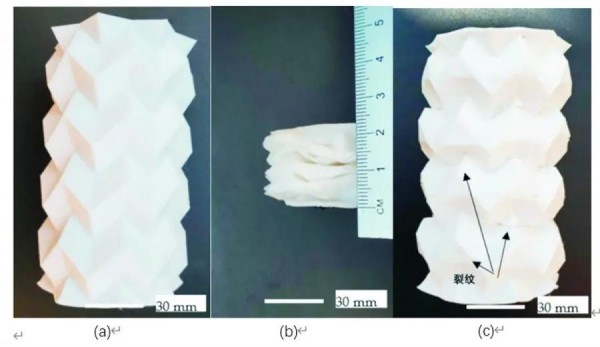 图(b)展示当折叠时,物体体积变小。当展开时,物体体积变大但物体上出现了细微的几条裂纹,如图(c)所示。