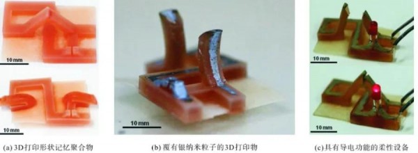 其中,图(a)的设备由一个3D形状记忆聚合物打印物体组成。图(b)是在室温下将银纳米粒子以烧结工艺添加到具有形状记忆性能的3D打印物体表面,制造的柔性电温度传感器。图(c)中,当柔性电温度传感器遇到温度上升后,它的形状发生变化,由开放电路变成关闭电路并点亮发光二极管。使用3D打印技术打印的具有形状记忆行为的柔性传感器,不仅赋予了电子设备以新的功能,而且在改变人与电子设备的互动方式的同时,也在提高产品质量方面发挥了重要的作用。